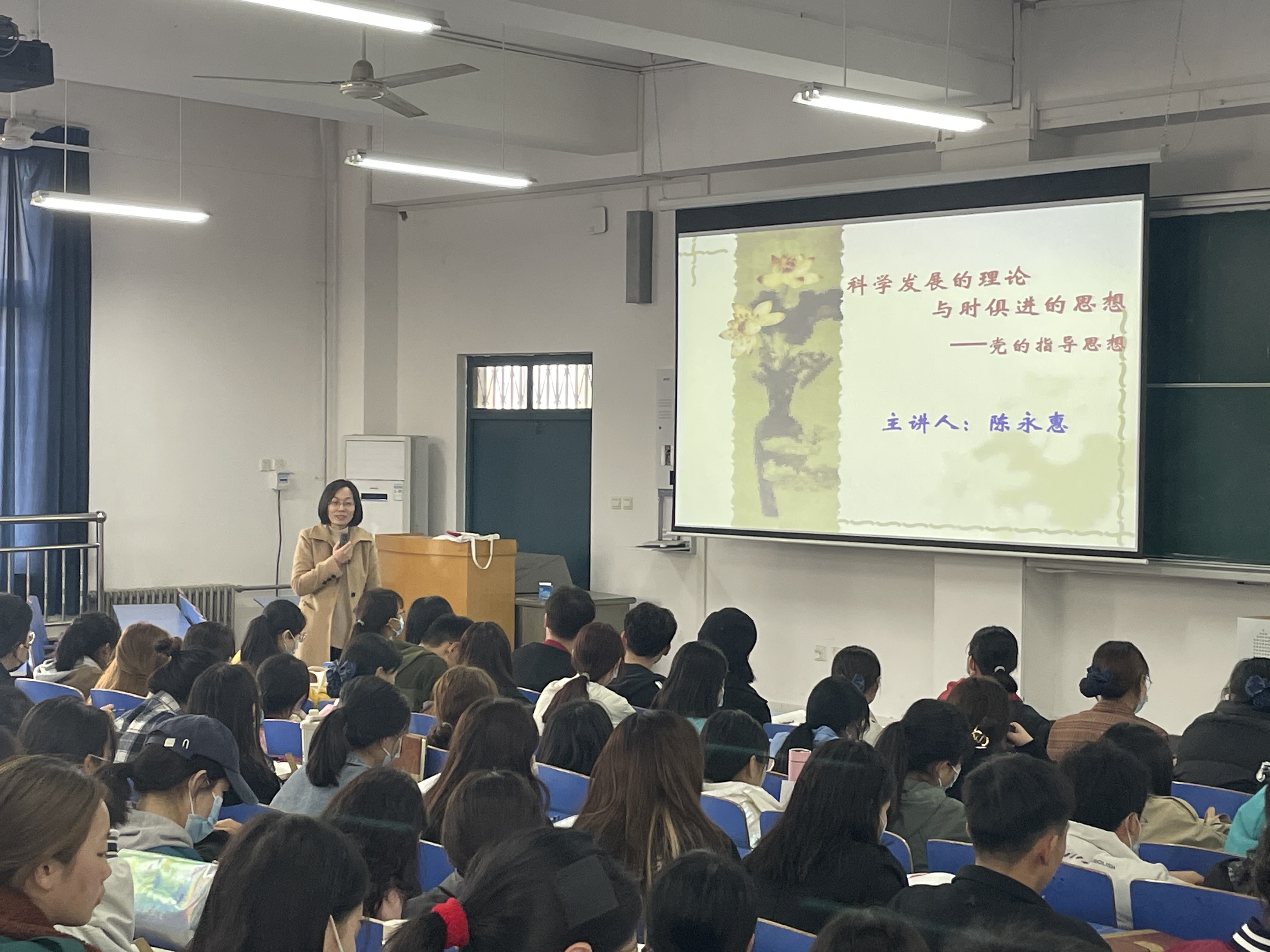 党课以《科学发展的理论,与时俱进的思想》为主题,内容围绕党的指导思想和中国特色社会主义理论体系展开,要求入党积极分子应认真学习贯彻马克思列宁主义,要将中国共产党的理论基础和行动指南作为严格要求自己的行动方向,陈院长其次指出,中国特色社会主义理论体由毛泽东思想,邓小平理论和三个代表重要思想以及习近平新时代中国特色社会主义思想相结合而不断发展壮大,并要求全体入党积极分子坚持党的指导思想,坚持科学发展理论,为中国特色社会主义事业的进步贡献自己的力量。
