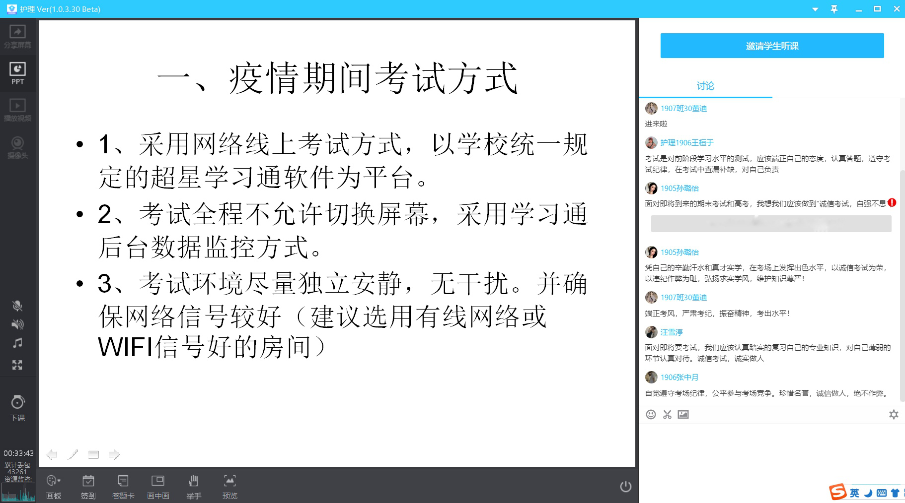本次活动由各班任课老师负责,通过课上播放PPT的形式,从网络考试方式、注意事项、违纪违规认定方式、以及相对应的处理方式等方面为同学们详细讲解了本次特殊时期网络考试的相关纪律和考试要求。并针对如何正确处理考试中的意外作了指导,从而有效缓解了网络考试带来的陌生感和紧张感。同学们也针对诚信考试展开讨论,以诚信的态度对待每一场考试,考出真实水平,弘扬诚信正义。同时也认识到了本次网络考试的严肃性,努力复习备考,诚信考试,做到问心无愧,无悔青春。