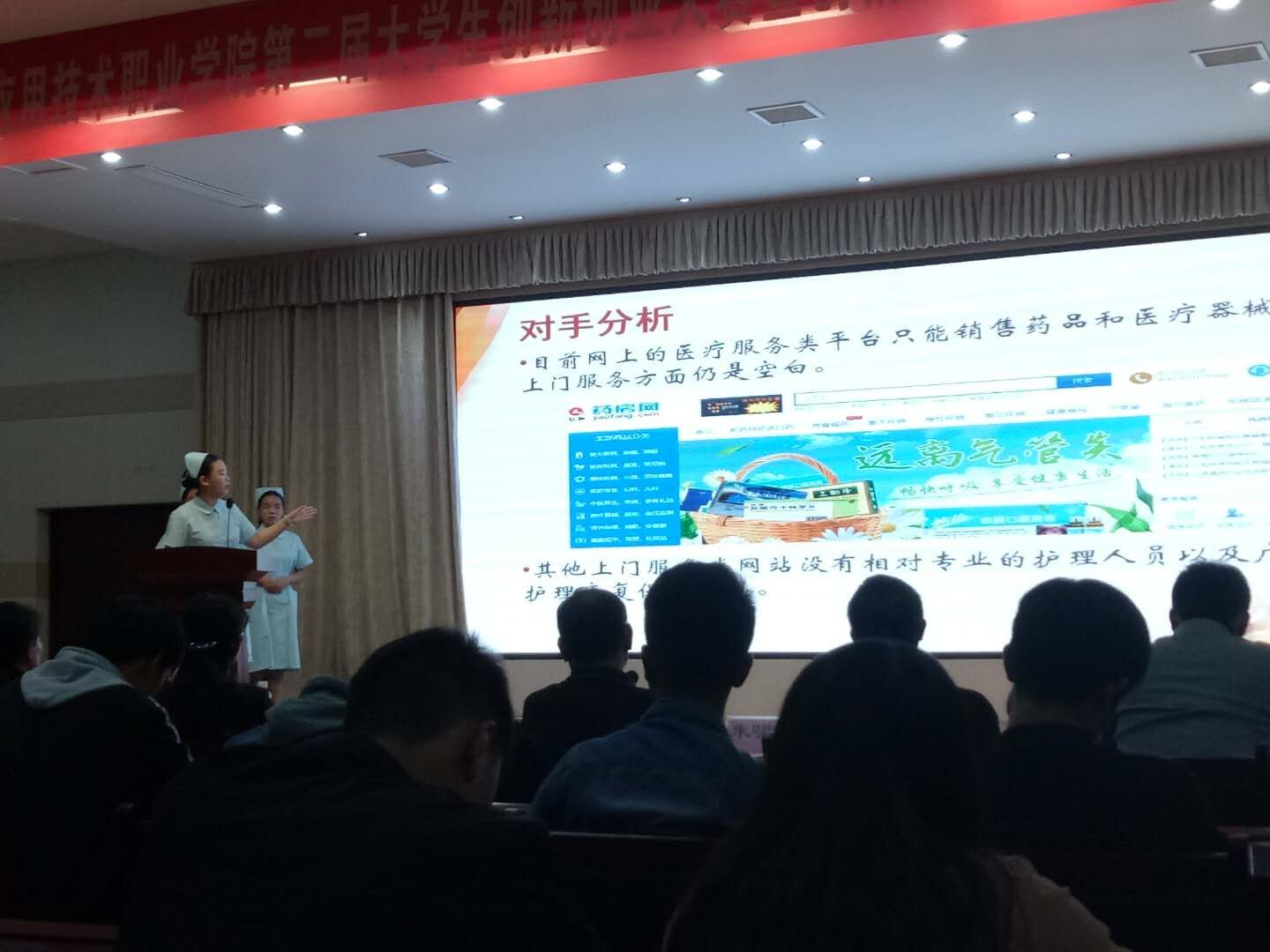 比赛场上,四位同学通过PPT演示、现场答辩,向大家展示了该项目的运作方式、服务对象以及专业知识等,他们从容的心态、流畅的语言,赢得了在场评委的赞赏和全体师生的阵阵掌声。